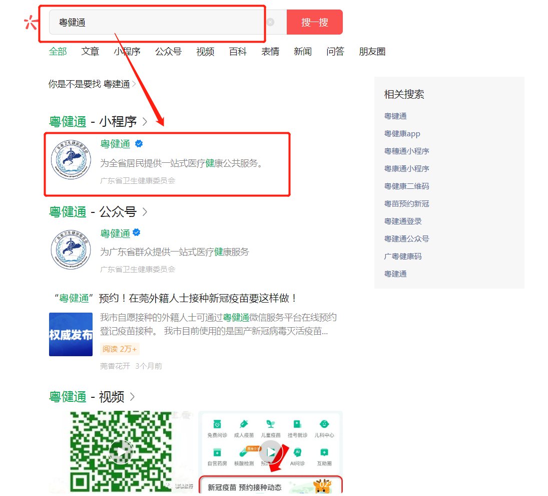 1.微信搜索框搜索“粤健通”(点此获取小程序码),点击小程序标题下的“粤健通”进入小程序。