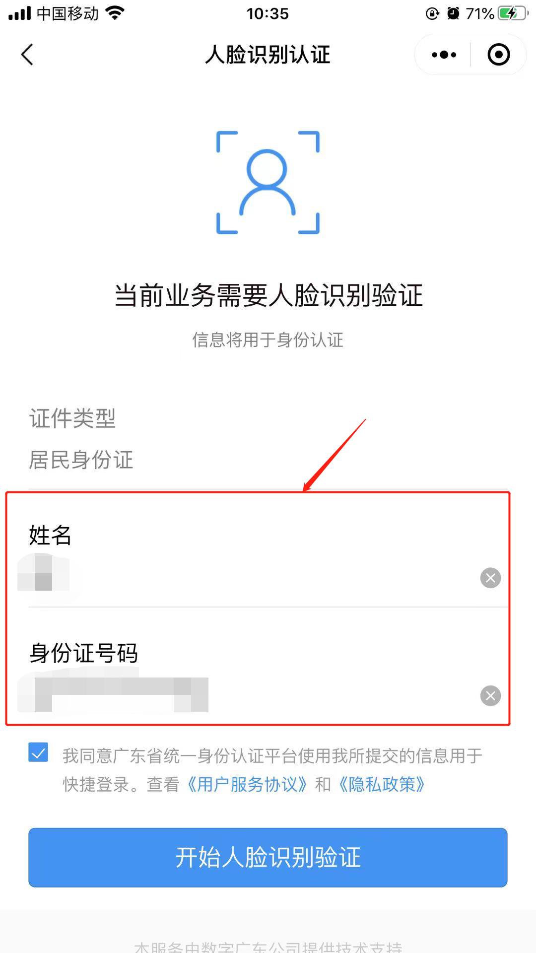 3.登录页面选择“人脸识别登录”后,填写姓名和身份证号码,勾选同意,开始人脸识别验证。