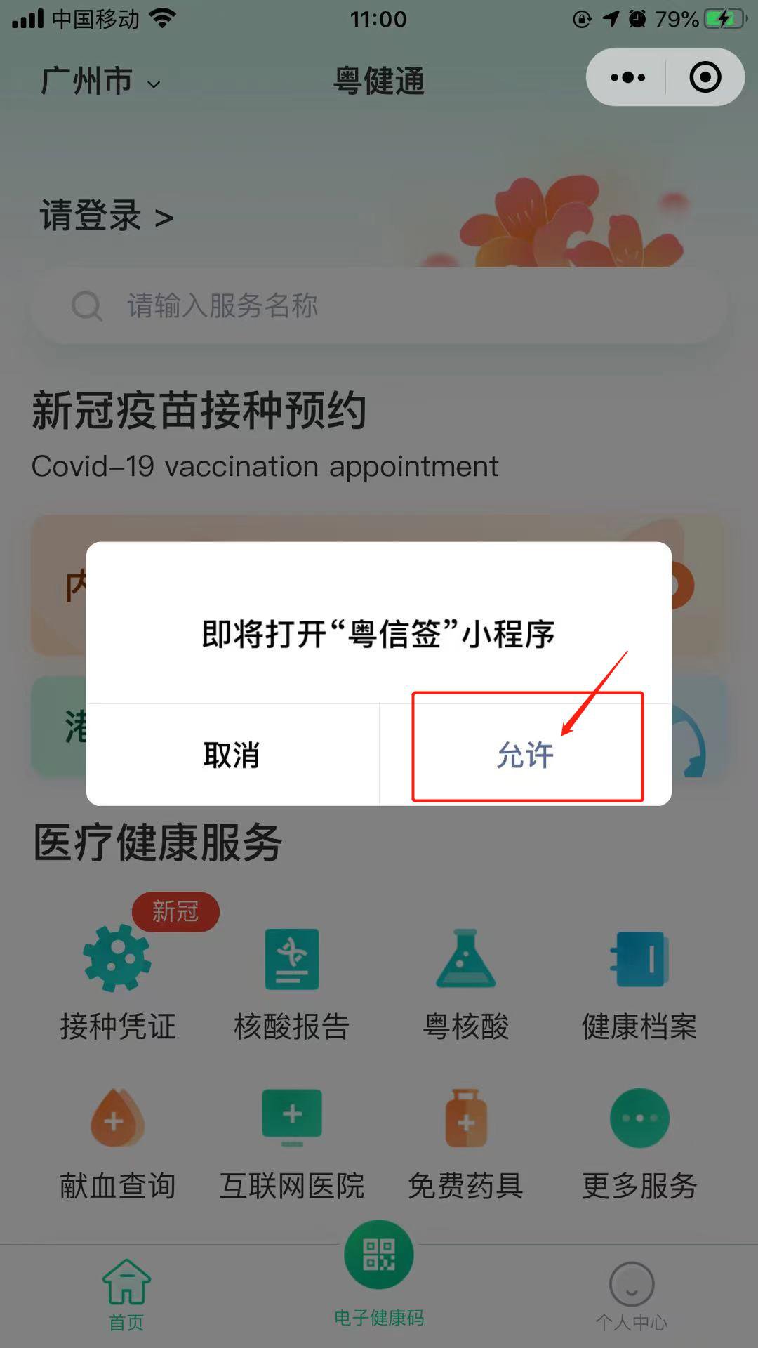 2.进入小程序后,左上角城市选择“揭阳市”,然后点击“请登录”,“允许”进入登录页面。