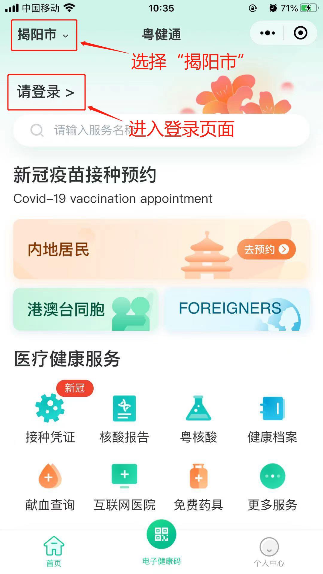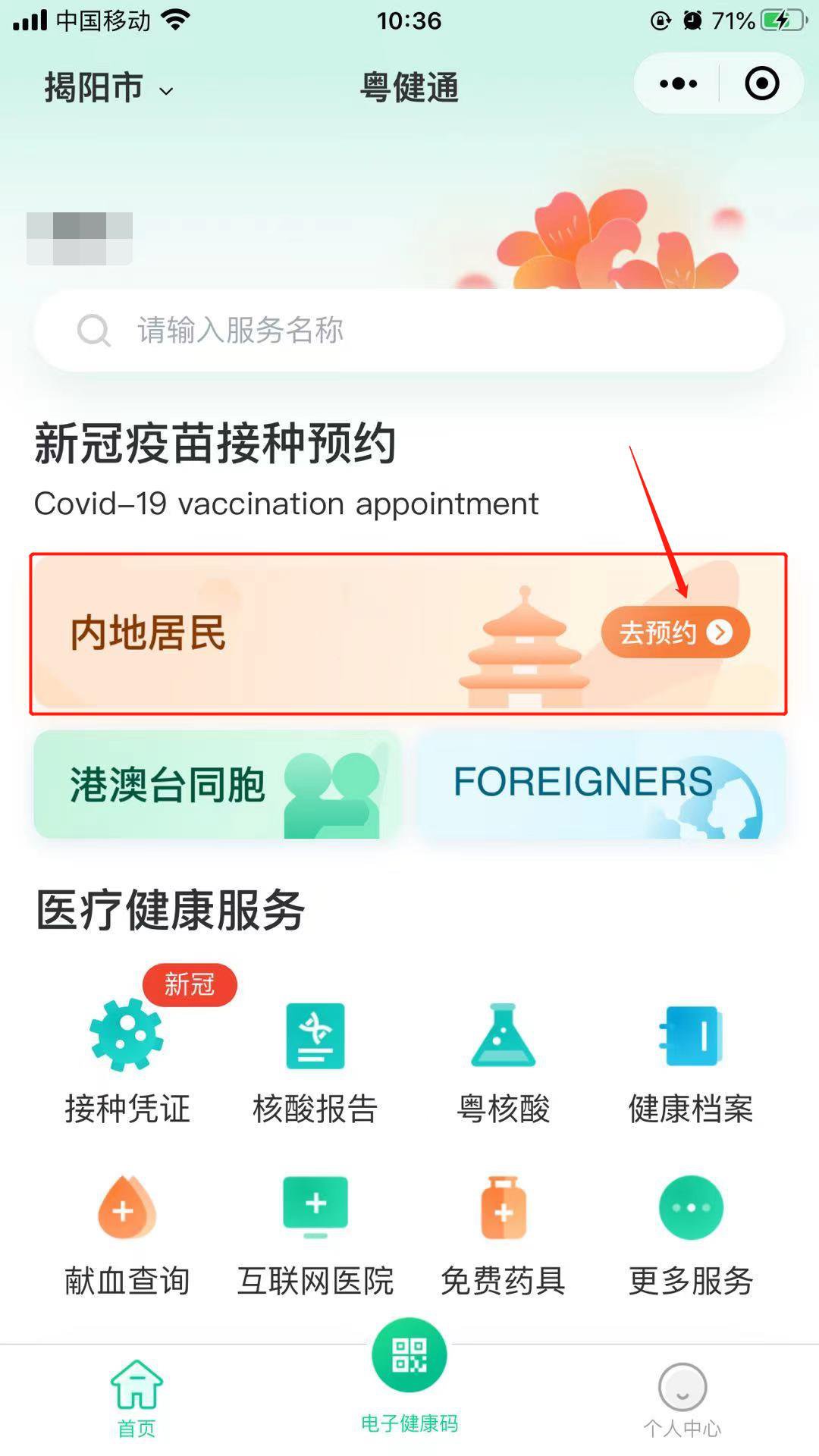 “粤健通”小程序预约揭阳新冠疫苗流程指南(内地居民为例)