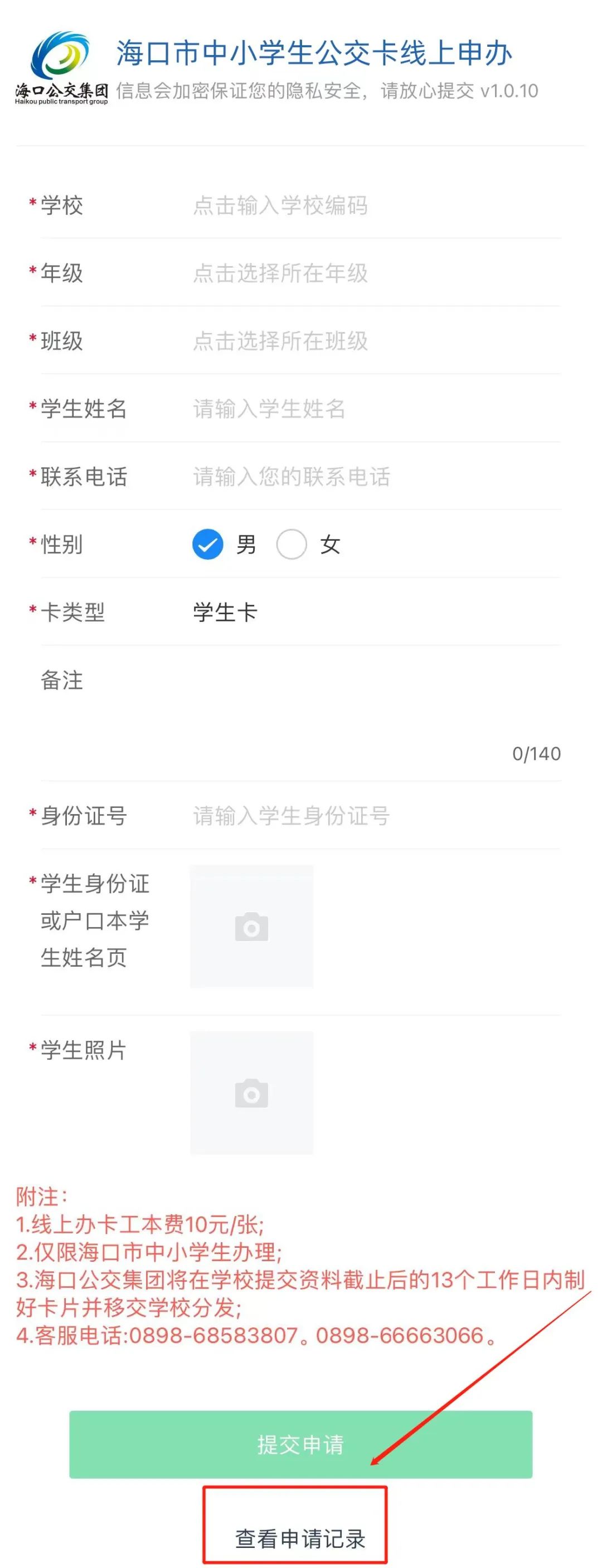 提交成功后,可通过“海口公交集团”微信公众号-公交服务-学生卡申办-查看申请记录
