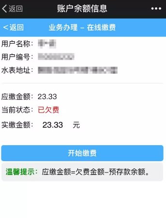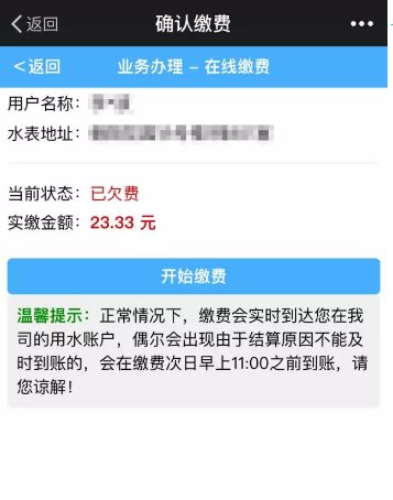 再次确认缴费。点击“开始缴费”之后,温馨提示会变成:正常情况下,缴费会实时到达您在我司的用水账户,偶尔会出现由于结算原因不能及时到账的,会在缴费次日早上11:00之前到账,请您谅解。