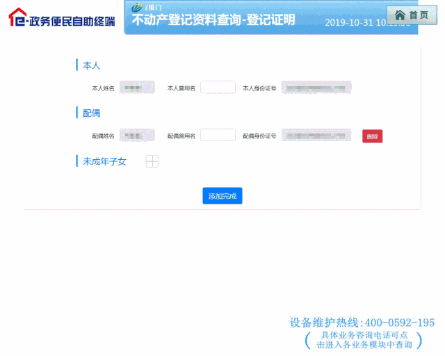 在“e政务”首页选择“不动产登记资料查询-登记证明”按钮,刷身份证+刷脸进入业务办理界面,点击添加“家庭成员”按钮
