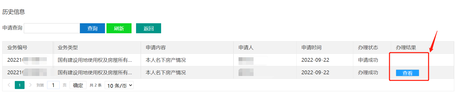 点 击 “ 我 的 业 务 ” 查 询 办 理 进 度,办理结果处,显示“查看”按钮,即可点击查看房产情况 点击“评价并下载”按钮,下载房产证明文件,自行打印即可