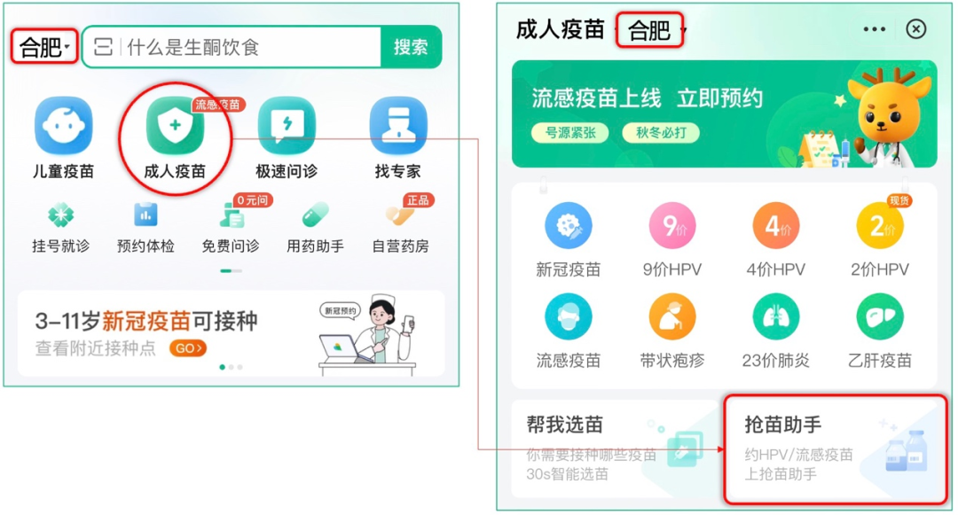 2.选择“合肥”地区,点击医鹿App首页“成人疫苗” ,进入页面后再点击“抢苗助手” 。