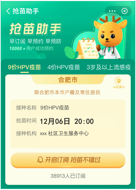 进入抢苗助手页面,找到对应抢苗场次,提前订阅(系统会在临近时间下发短信提醒)。疫苗开放预约时订阅按钮将变为预约入口,点击进入。