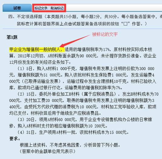(3)用鼠标在题干区选中文字(包括数字、符号、算式、会计分录等,下同)后,再用鼠标点击“标记文字”按钮(下图红框处)对选中部分的文字加上高亮标记,可以将试题中重要的信息突出显示,方便查看。对试题文字所作的标记,不会作为考生答案的一部分,也不会影响考生的成绩评判。用鼠标在试题区选中一段已标记的文字后,再用鼠标点击“取消标记”按钮(下图红框处)可以清除选中部分文字的高亮标记。