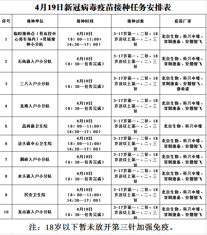 4月19日,佛冈县开放新冠病毒疫苗接种门诊有: