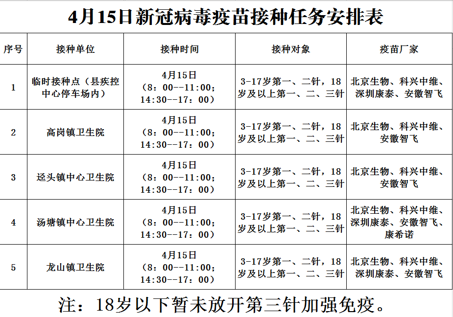 4月15日,佛冈县开放新冠病毒疫苗接种门诊有: