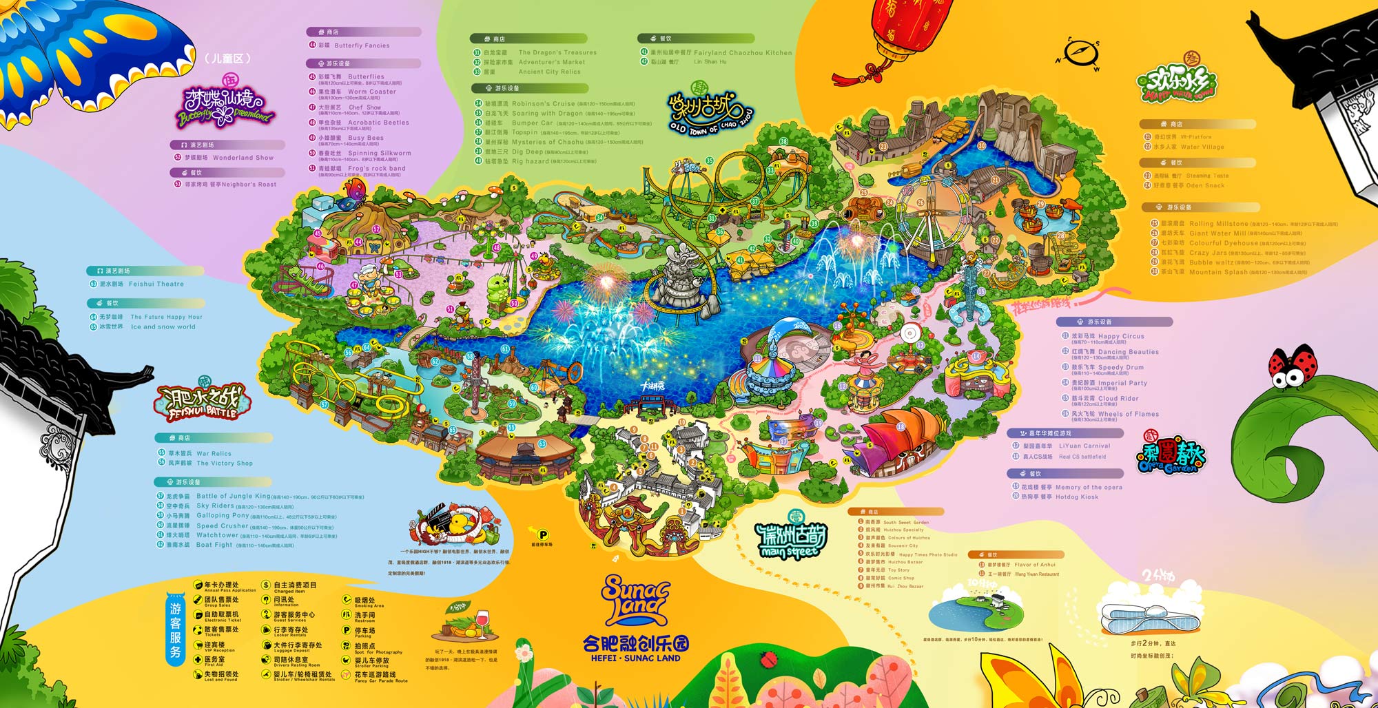 合肥融创乐园位于合肥融创文旅城核心位置,充分融合先进科技和传统徽派文化精髓,是一座特色徽文化主题乐园,拥有徽州古韵、梨园春秋、欢乐水乡、巢州古城、梦蝶仙境、 淝水之战六大主题区域。这里有高56米、时速125公里,带来风驰电掣般体验的立环过山车“白龙飞天”;相对而发同时翻转俯冲、格外惊险刺激的断轨过山车“龙虎争霸”等32台风格各异的游乐设施,以及梦幻花车巡游、大湖秀等多台精彩演艺。您可以在这里尽情穿越历史,体验古今文化的激烈碰撞。