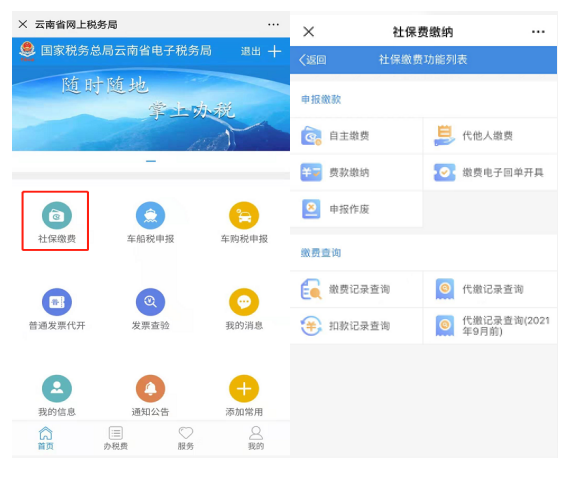1.通过【云南省电子税务局】-【首页】-【社保缴费】进入【社保缴费功能列表】