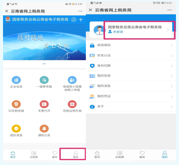 1.进入【云南省电子税务局】官网,通过【业务办理】-【我的】-【未登录】。