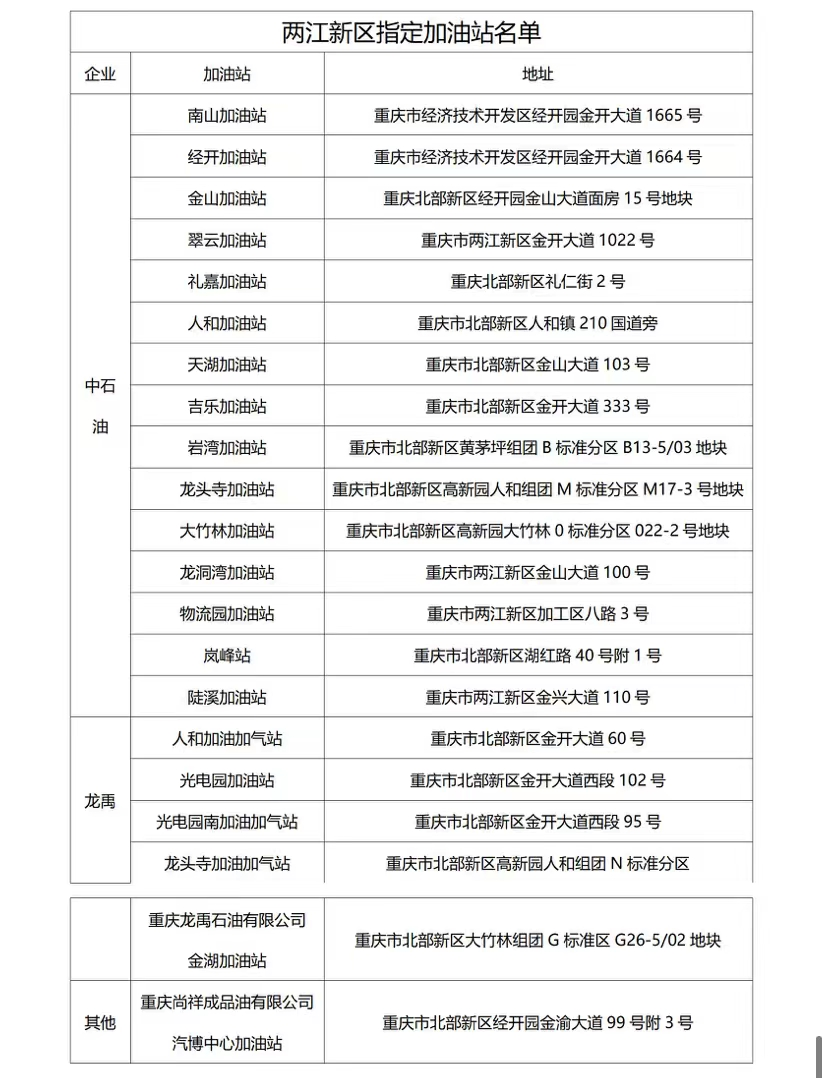 仅限两江新区指定加油站