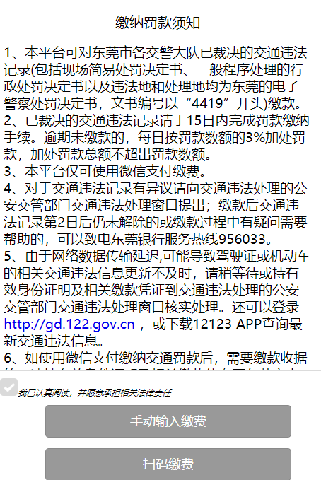 1、缴纳平台可对东莞市各交警大队已裁决的交通违法记录(包括现场简易处罚决定书、一般程序处理的行政处罚决定书以及违法地和处理地均为东莞的电子警察处罚决定书,文书编号以“4419”开头)缴款。