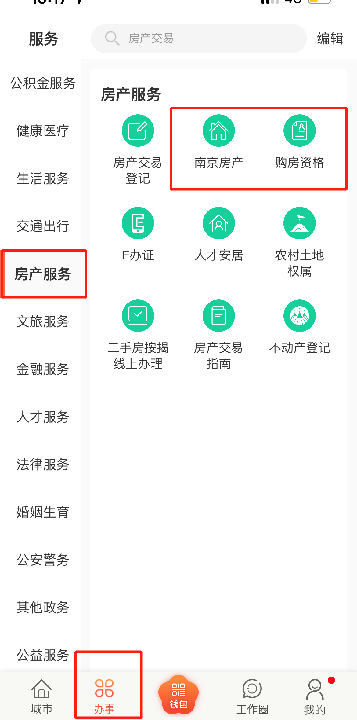 2.在“南京房产”中点击“购房资格”/“南京房产”,进入后根据提示填写相关信息进行申请。