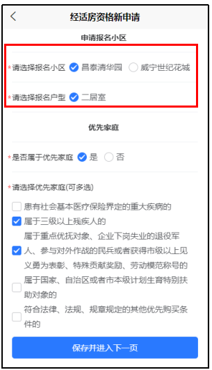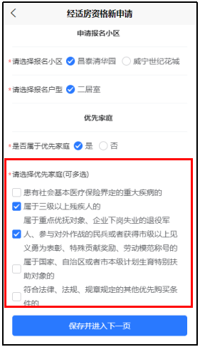 12. 如果“是否属于优先家庭”选择“是”,则需要选择优先类型,并在下一页上传佐证材料,点击“保存并进入下一页”。