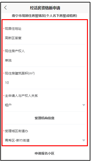 10. 填写“现居住房屋情况”和“受理机构”信息。