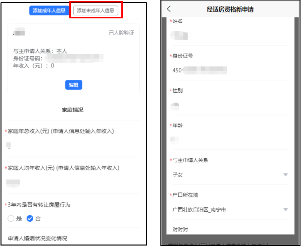 8. (可选)添加共同申请人,根据实际情况点击“添加成年人信息”和“添加未成年人信息”,添加成年人信息参考步骤8-9的操作,添加未成年人信息如下所示。