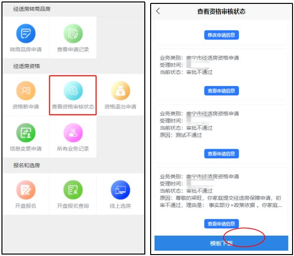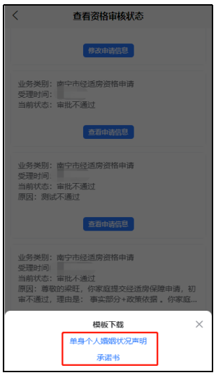 14. 查看经适房的资格审核状态,点击“查看资格审核状态”,当需要补充“婚姻状况声明”和“承诺书”时,点击“模板下载”即可下载文件,填写后上传文件。