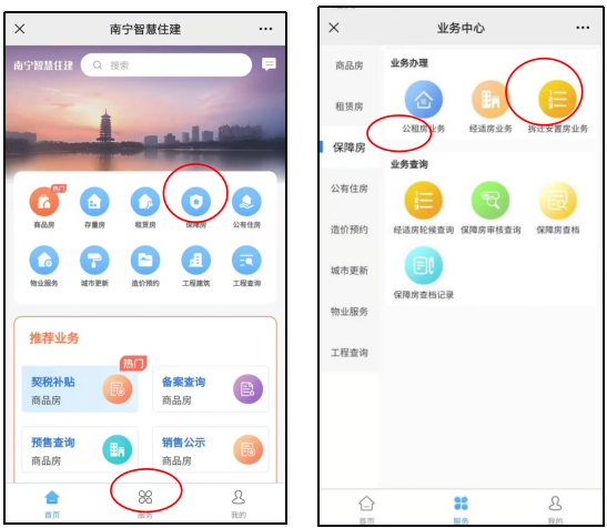 2. 点击“保障房”或者“服务”菜单,进入“业务中心”页面,选择“经适房业务”。