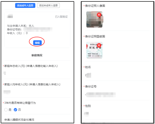 6. 编辑主申请人信息,点击“编辑”,上传身份证照片并完成人脸验证。