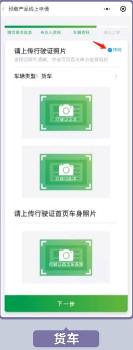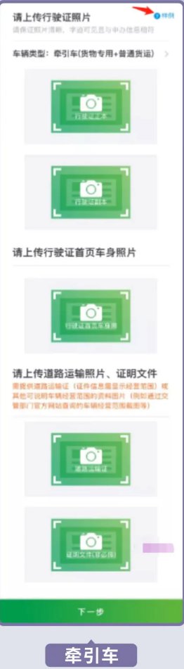 4.根据所选车辆类型上传行驶证、道路运输证等证件图片(可点击右上角样例查看照片上传指引),确认并补充资料,车主与申办人不一致时还需上传车主证件;