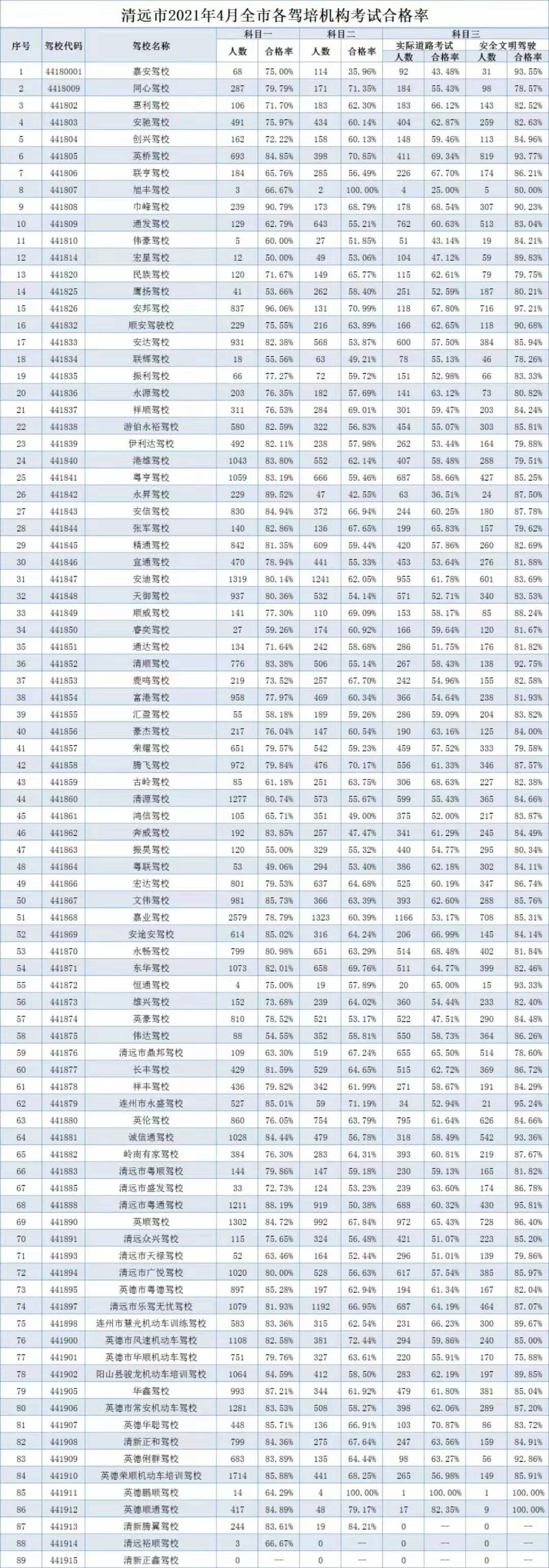 2021年4月份全市驾培机构考试排名出来啦!见下图!