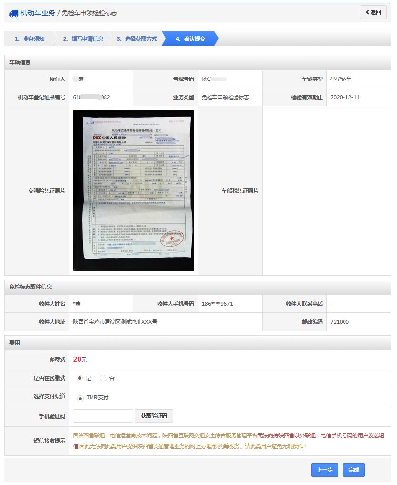 再次确认信息以后,点击【获取验证码】,系统会发送6位验证码到用户绑定的手机,用户输入手机验证码后,点击【完成】,进入步骤6【完成提交】。如果选择在线支付,提交后自动跳转至支付页面进行网上付款。