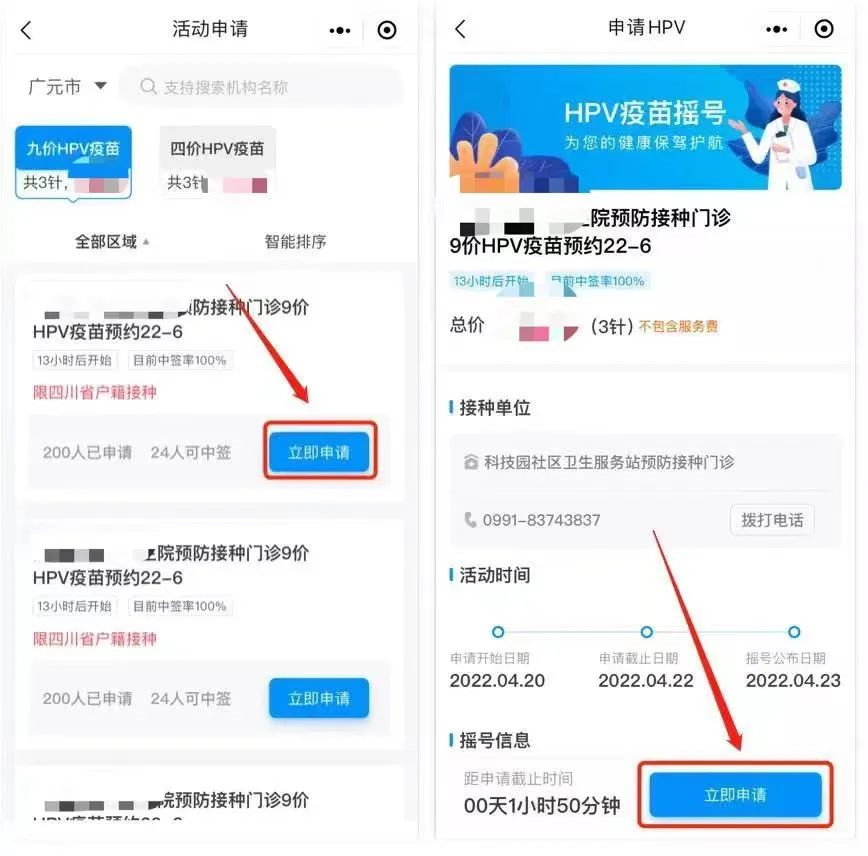 选择所在区域的接种门诊,点击“立即申请“,然后进入活动详情页确认相关信息再次点击”立即申请“