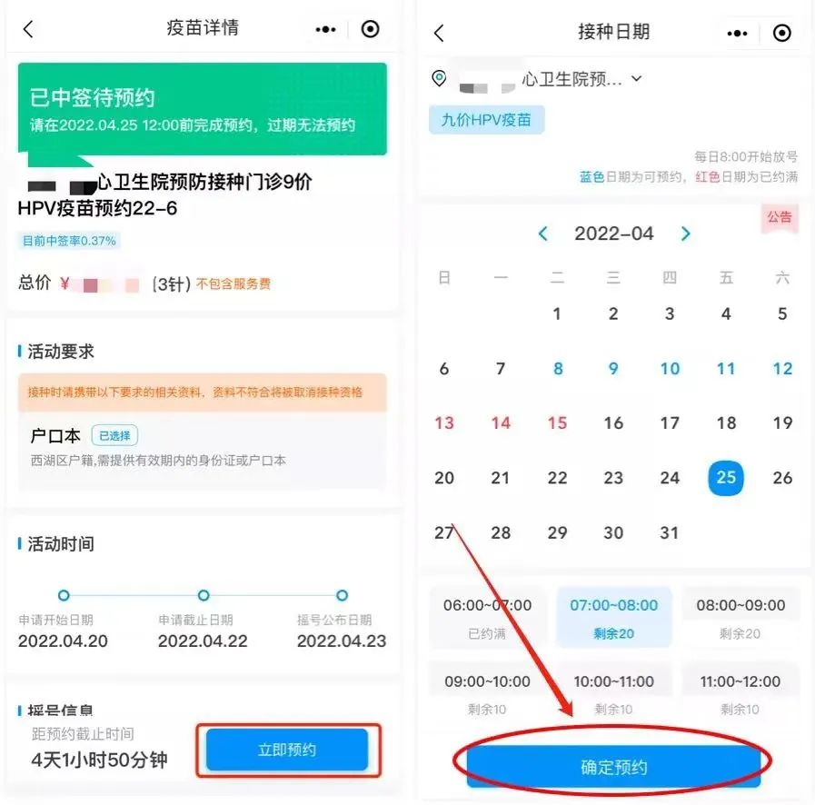 已摇号成功的中签用户,点击“立即预约”选择您想要接种的日期与时间段;