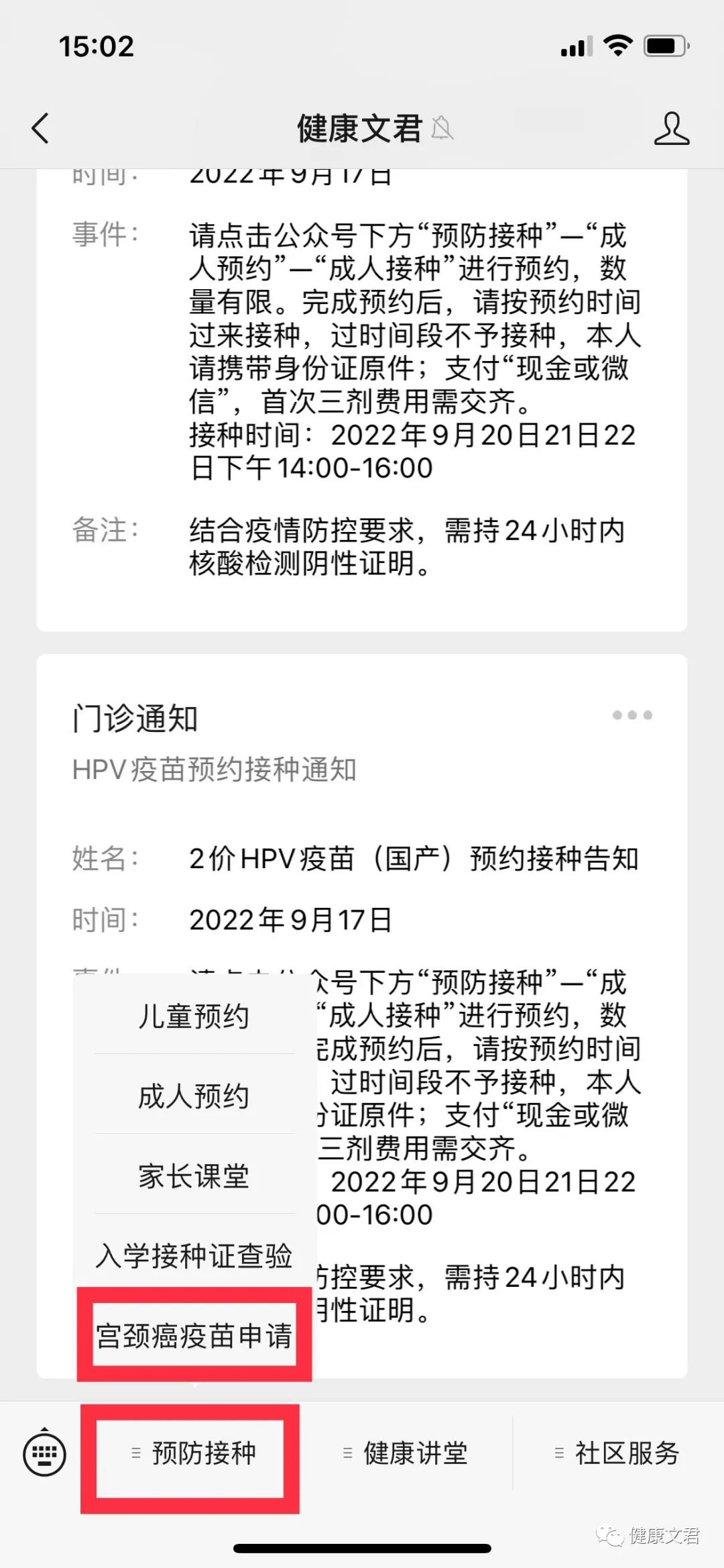 HPV预约入口:微信搜索“健康文君”或扫码关注公众号。