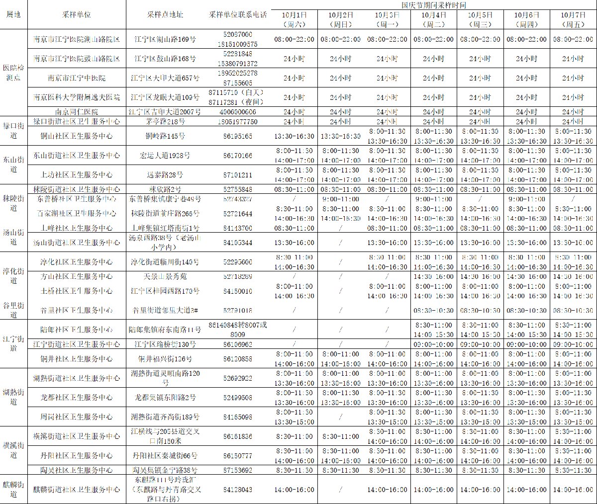 2022国庆期间南京江宁区愿检尽检核酸检测服务点+服务时间