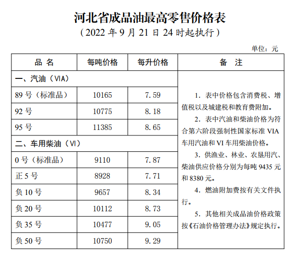 根据现行成品油价格形成机制,自 2022 年 9 月 21 日 24 时起,河北省汽、柴油价格(标准品)每吨分别降低 290 元、280 元,调整后的汽、柴油最高零售价格见下表。乙醇汽油价格按同标号汽油(VIA)价格执行,普通柴油价格按照同标号车用柴油(VI)价格执行,98 号汽油价格由成品油生产经营企业根据市场情况自主制定具体价格。