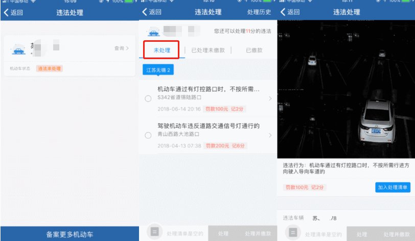 第一步:用户选择违法待处理的机动车后,进入未处理违法列表界面,并可点击对应违法记录,查看具体违法内容详情。
