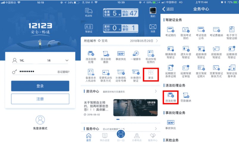 登录"交管12123"APP后,通过【业务中心】→【违法处理】,进入违法处理业务流程。