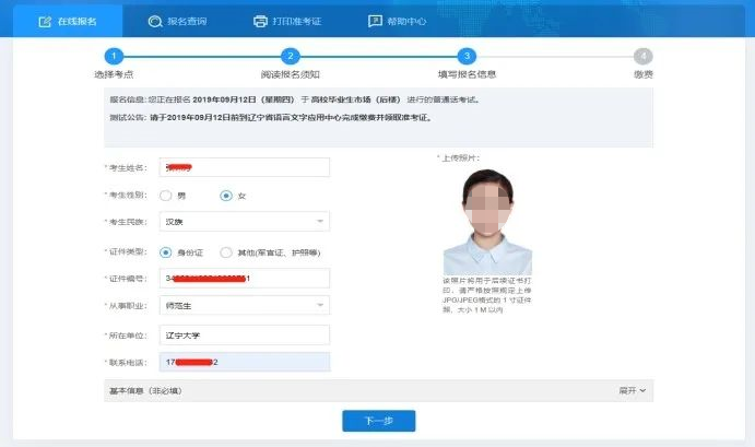 3.填写完整的个人信息后,上传电子版个人正面近期免冠彩色照片(无美颜),白底,像素不低于390*567,格式为jpg,大小不超过1M(一定要提前准备好符合条件的照片,否则可能影响报名)。认真审核所填信息,无误后点击“下一步”按钮(点击此按钮后信息无法进行修改),如信息有误、照片不符合要求报名无效;