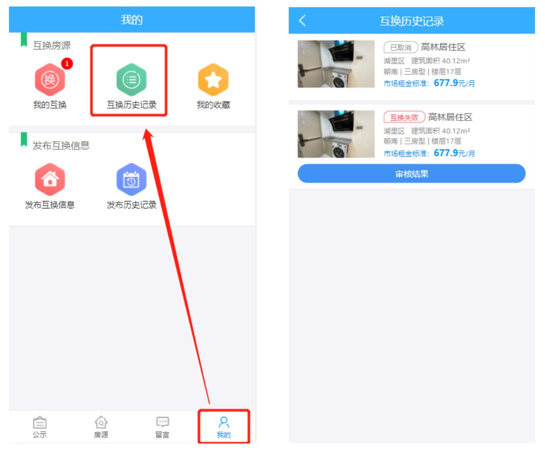 承租户通过“我的->互换房源->互换历史记录”进入。