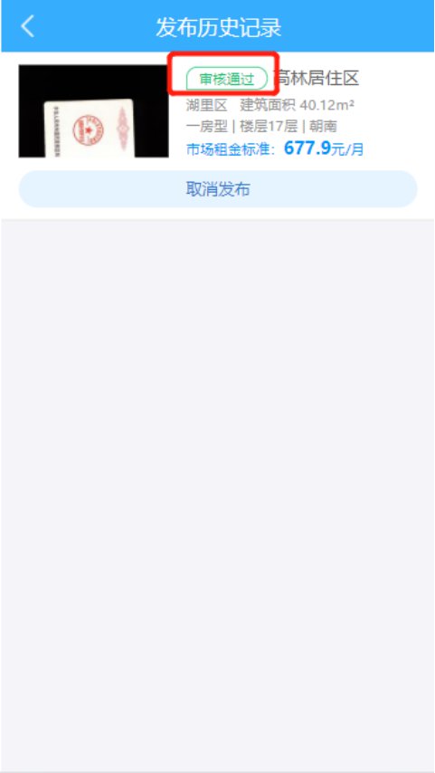 当承租户发布的互换信息已被后台管理员审核通过。则显示“审核通过”状态。该状态下承租户可在房源列表中查看到符合意向房源的房源资源且承租户可在此取消对外发布互换信息。