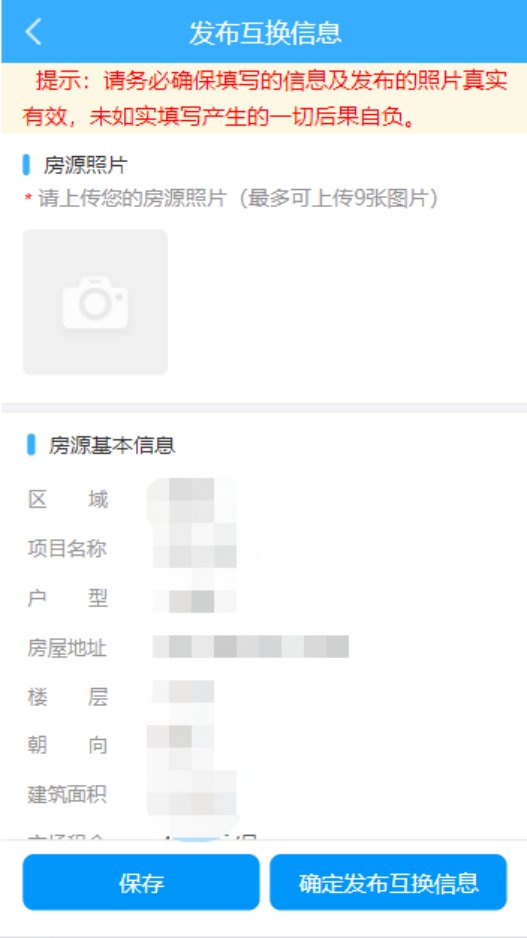 在发布互换信息页,填写带“*”的必填信息如上传房源照片,意向互换房源要求:区域、项目名称;非必填信息如房型介绍、装修描述、教育配套 、医疗配套、生活配套、交通配套,用户根据实际情况补充。