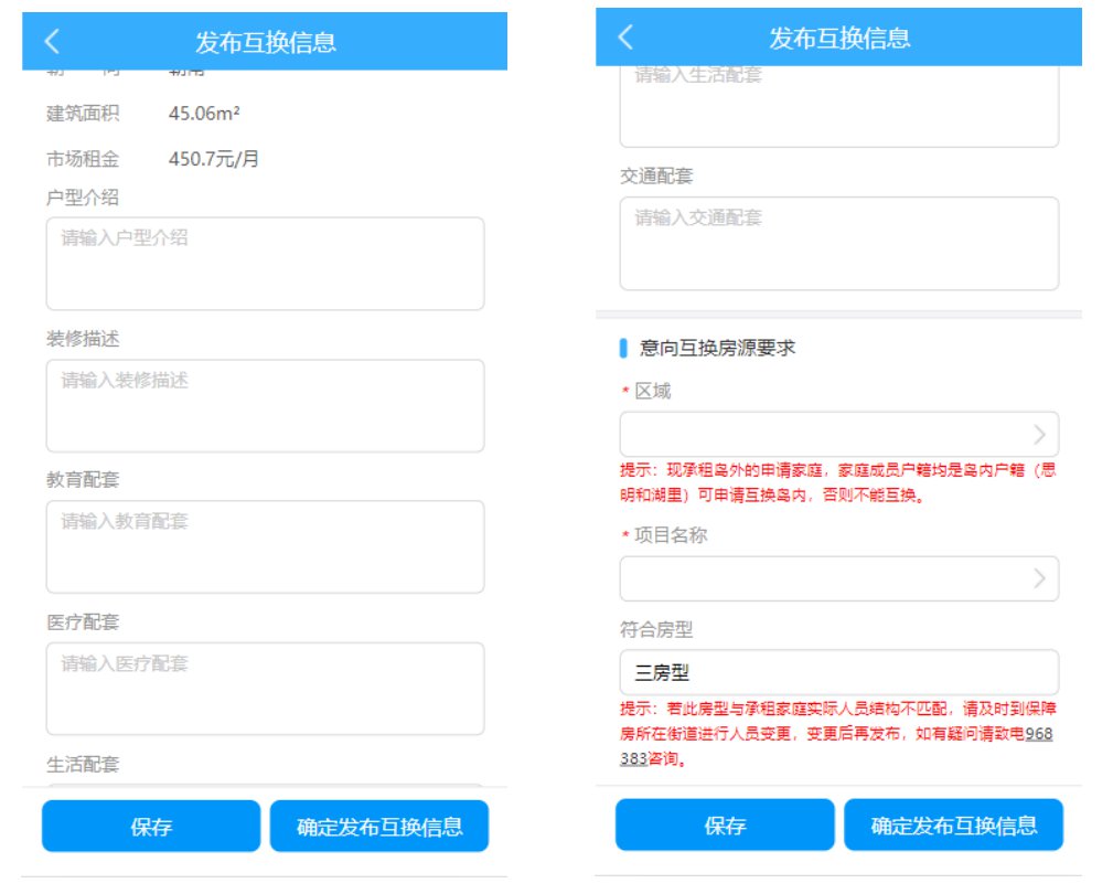 承租户想要与其他承租户进行房源互换,须先发布互换信息且管理员审核通过后,公布在房源列表中,才能被其他符合互换意向的承租户浏览。具体进入“我的->发布互换信息->发布互换信息”中操作。