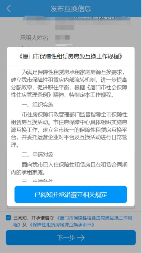 点击“下一步”系统会跳出《厦门市保障性租赁房房源互换工作规程(试行)》;