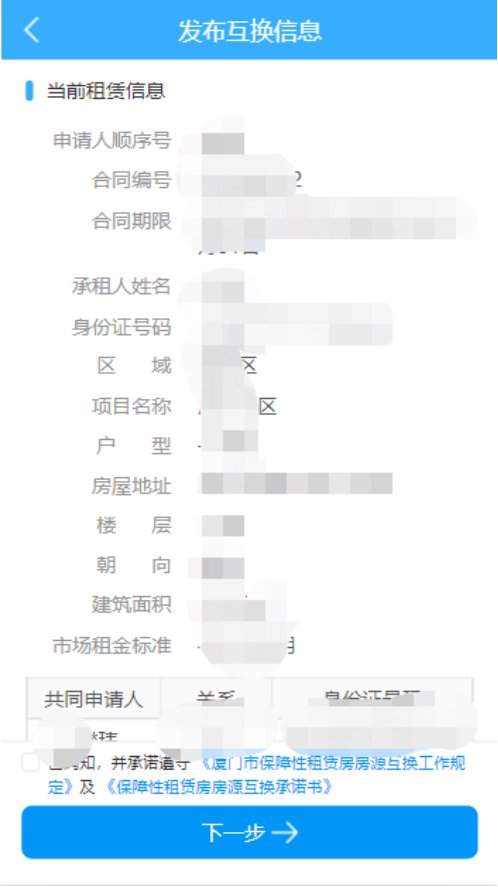 点击“发布互换信息”,可以查看到当前承租的租赁信息(合同信息、房屋信息及共同申请人信息)。