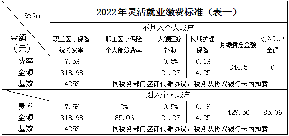 (一)2022年乌鲁木齐市灵活就业人员的缴费基数为2021年自治区全口径城镇单位从业人员平均工资的60%,即4253元/月。除已缴费满年限灵活就业人员外,每人每月按缴费比例不同可自行选择需承担的费用,详见下表一。