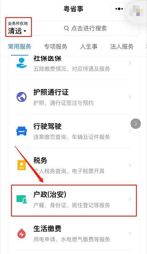第一步:打开“粤省事”小程序,左上角城市选择“清远市”,然后进行登录。下滑找到【户政(治安)】并点击进入户政页面。