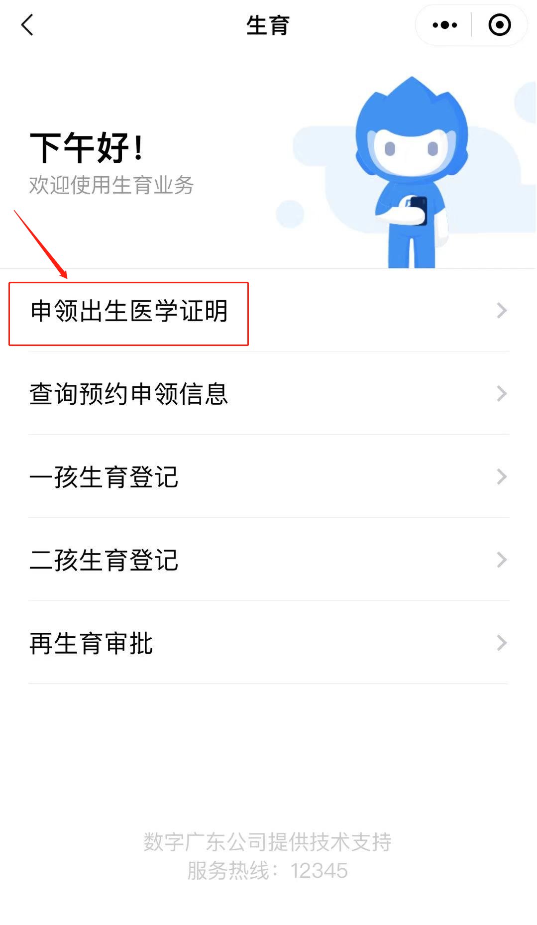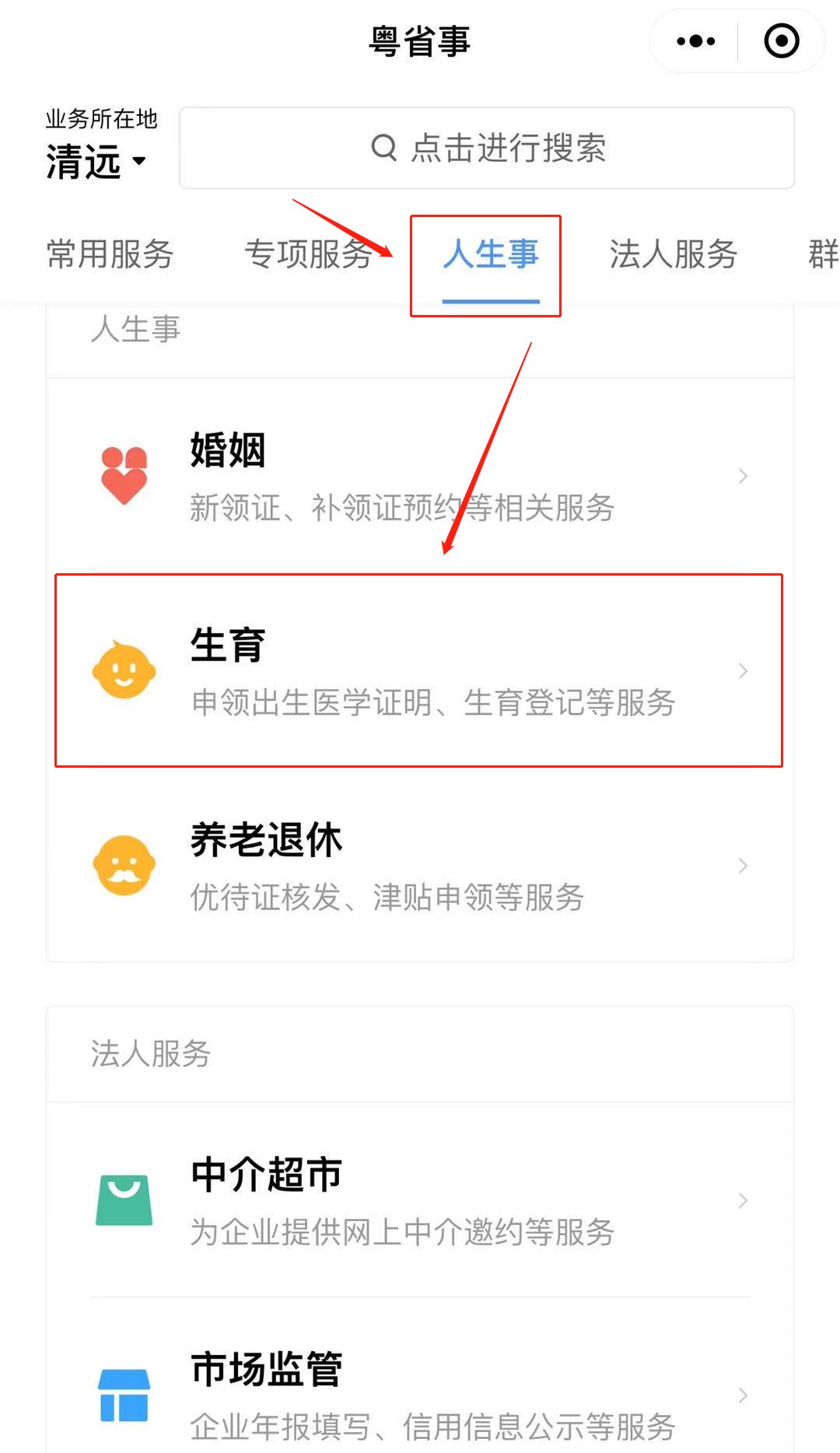 母亲登录粤省事,找到“人生事”,选择“生育”,选择“申领出生医学证明预约”,即可进入。