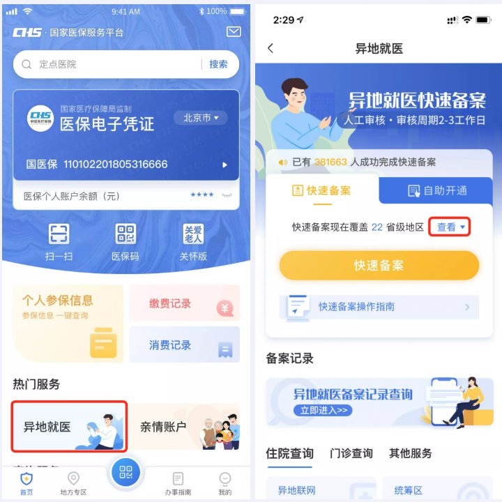 打开“国家医保服务平台”APP,在首页点击热门服务下的“异地就医”进入“异地就医”页面,点击“查看”按钮查询。