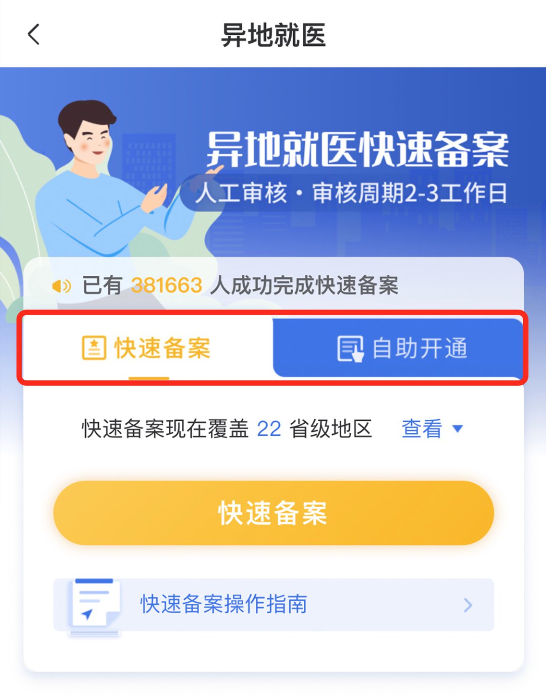 参保人查询个人参保地线上异地就医备案方式开通情况后,可在“异地就医”页面选择“快速备案”或者“自助开通”的方式进行备案。
