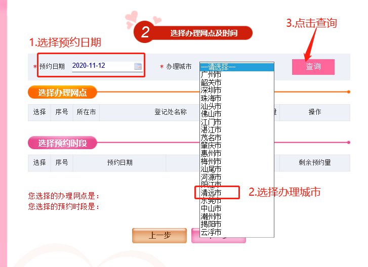 第四步:选择预约日期和办理城市,点击查询,然后选择办理网点