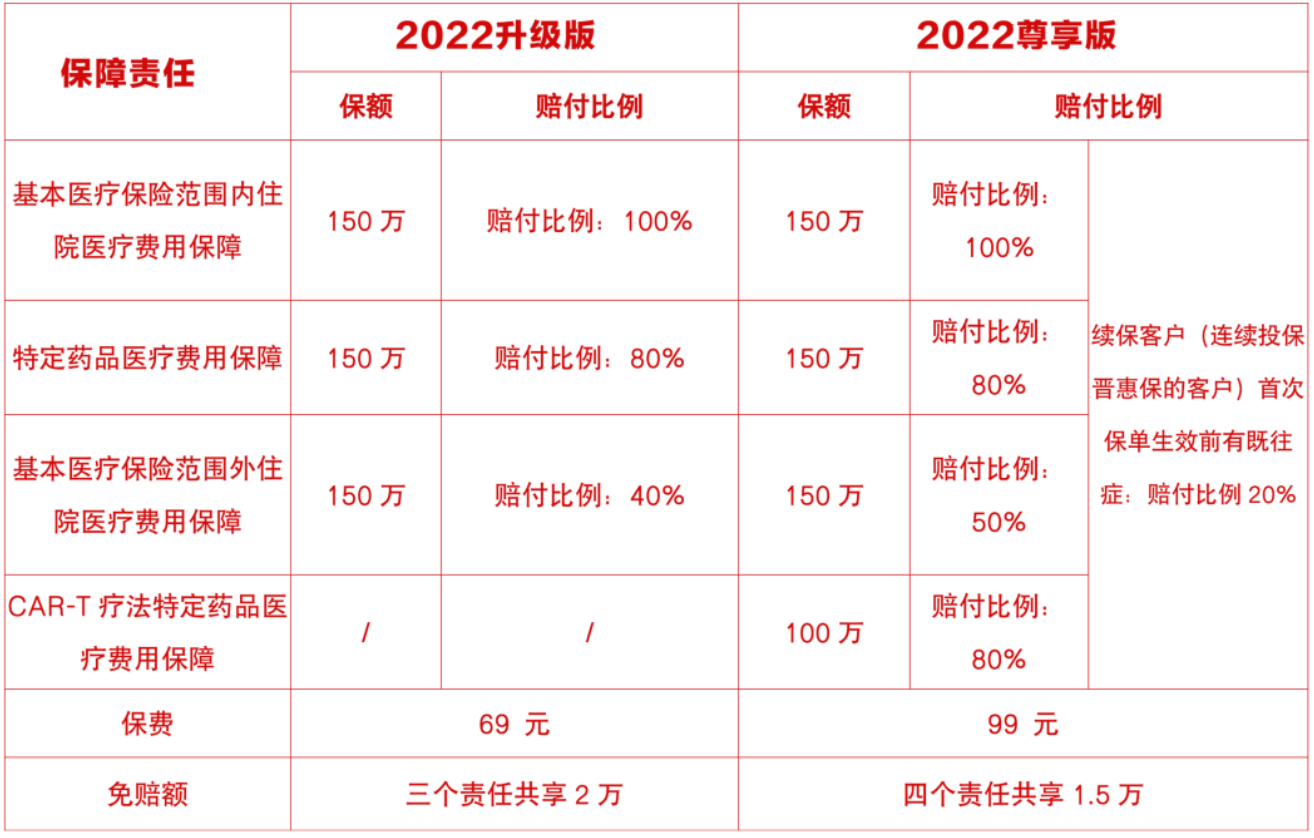 被保险人连续购买(指购买有晋惠保2020版、2021版、2022版三个保单或购买有晋惠保2021版和2022版两个保单)的首次保单生效前的既往症,属保险责任,基本医疗保险范围内住院医疗费用保障、基本医疗保险范围外医疗费用保障、特定药品医疗费用保障、CAR-T疗法特定药品费用保障赔偿比例均按20%赔偿。