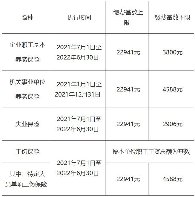 一、企业职工养老保险:缴费基数上限为22941元/月,缴费基数下限为3800元/月。